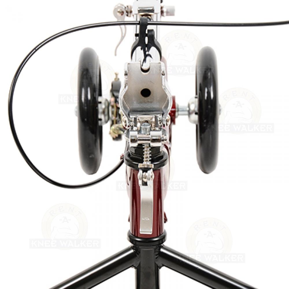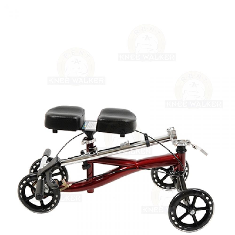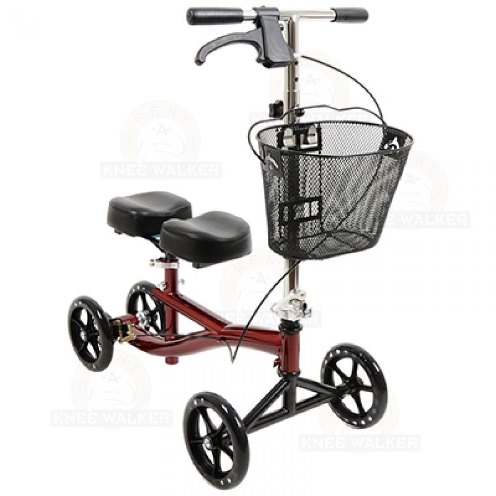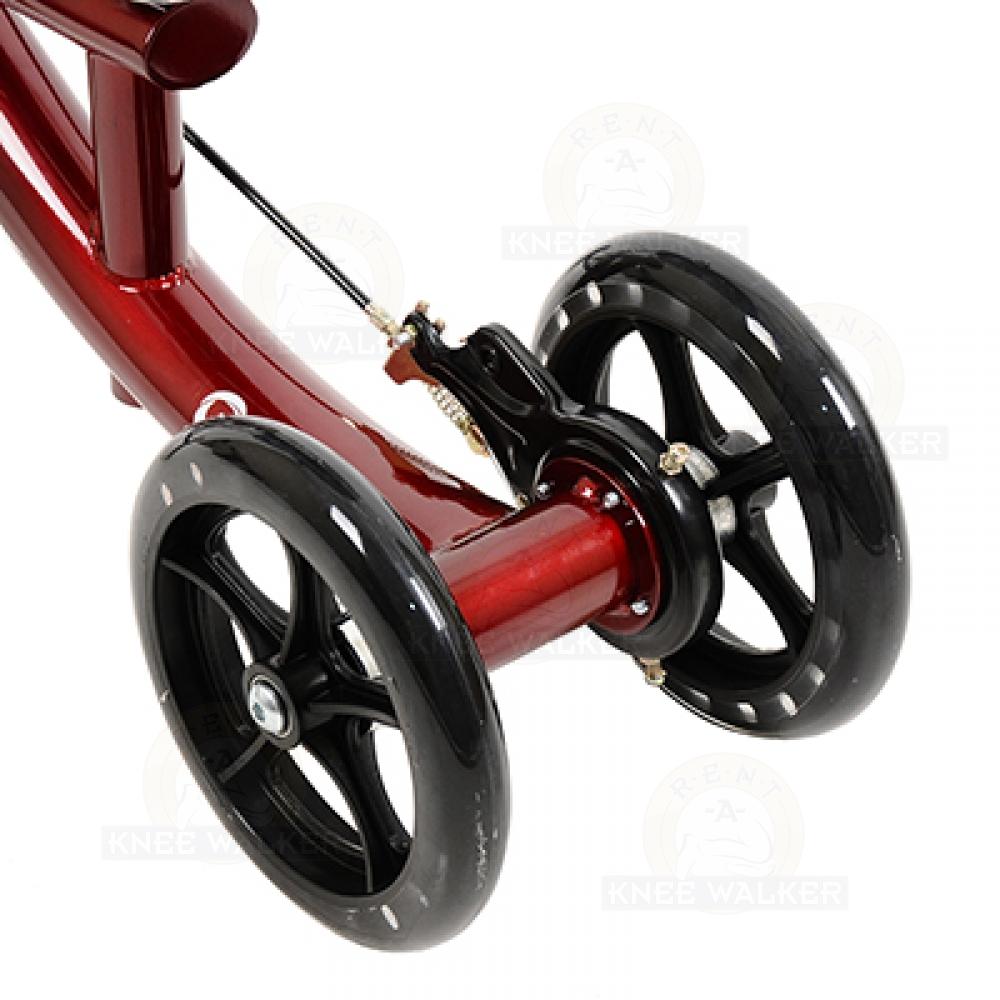 - The Roscoe Knee Scooter features large 8" wheels and a drum brake, so it works well both indoors and outdoors. This economy model utilizes pivot steering and offers a comfortable split knee pad design.
