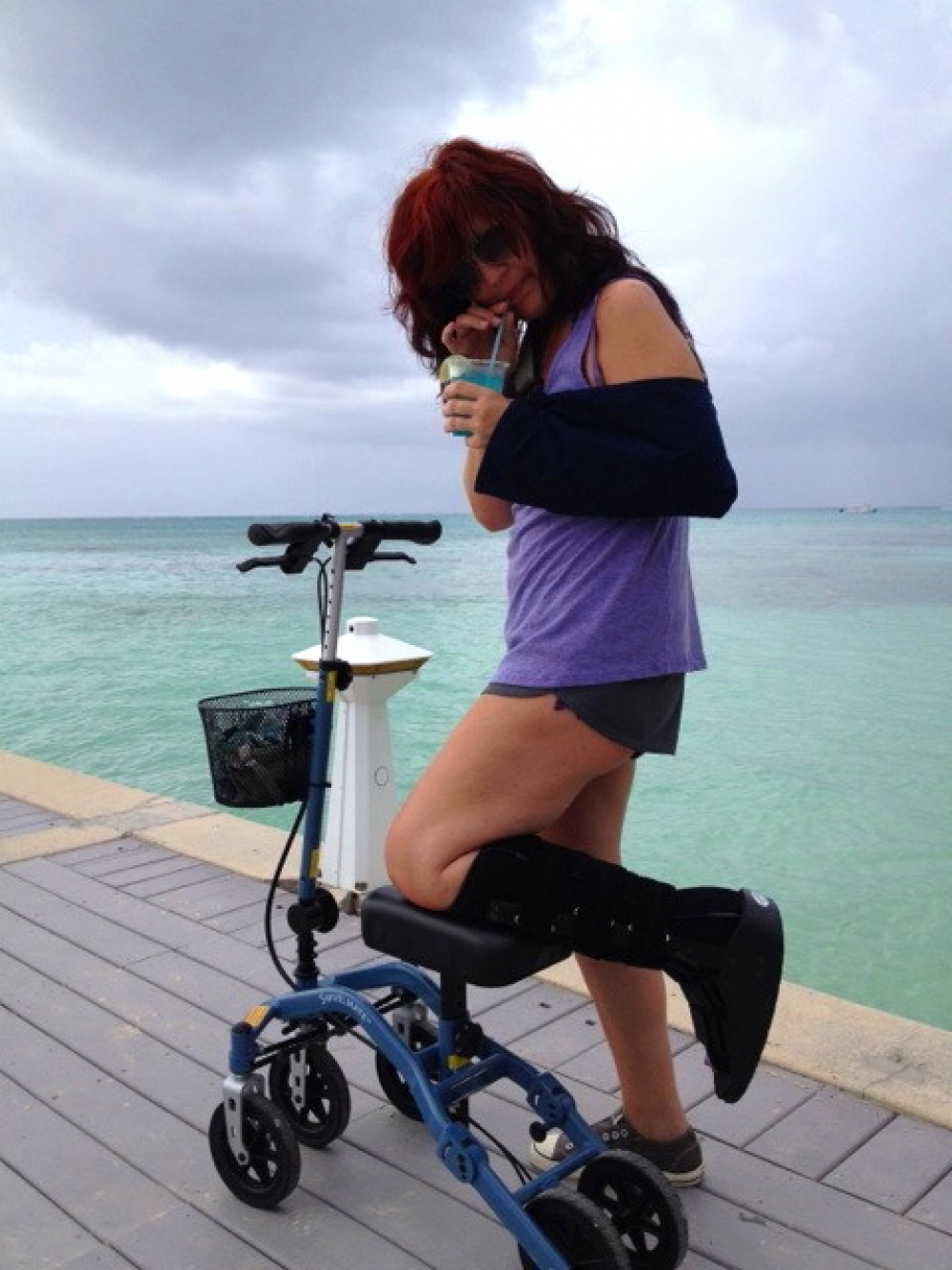 Me sipping on a Blue Lemonade while waiting for my husband and a few friends to come back from snorkeling. Although I couldn't swim, snorkel, or Scuba dive on this trip, I thoroughly enjoyed the sun, sand, and warm breezes off the Caribbean. Without the Swivelmate Knee Walker, I would have not even been able to go. Grand Cayman Island, B.W.I.